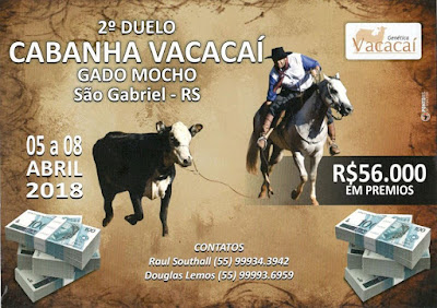 Mais um grande evento que acontece no mês de Abril, entre os dias 05 a 08, é na terra dos marechais, em São Gabriel/RS. É o 2º Duelo da Cabanha Vacacaí, no gado mocho. Laçada essa paralela ao 23º Rodeio Internacional do Mercosul. No Duelo aberto serão R$ 56 Mil em prêmios. Sendo R$ 35 Mil para força alta, R$ 15 Mil para força baixa, R$ 3 mil para os participantes do 1º duelo e mais R$ 3 Mil para quem estiver com a camisa do evento.