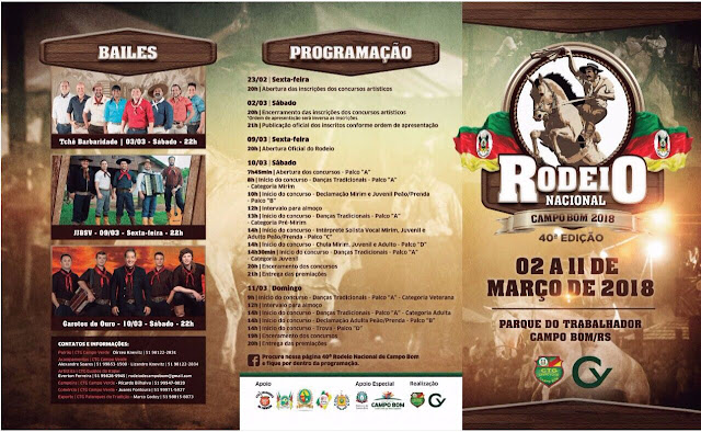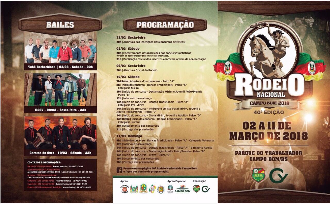 De 02 a 11 de Março de 2018, acontece um dos eventos mais aguardado do estado do Rio Grande do Sul e Brasil. É a 40º edição do Rodeio Nacional de Campo Bom, realizado pelo CTG Campo Verde. Ressalto esse evento como um dos melhores da atualidade. Rodeio completo, contém provas campeiras, danças artísticas, shows e bailes. Como carro chefe, destaco sua organização: Sempre impecável.