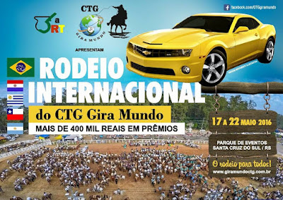Daqui exatos sete dias terá início o 1º Rodeio Internacional do CTG Gira Mundo. Com premiação na casa dos R$ 400 Mil é o rodeio mais esperado do ano. Como prêmio maximo o CTG Gira Mundo irá oferecer aos vencedores do laço duplas, um Camaro.