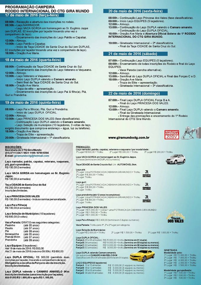 Daqui exatos sete dias terá início o 1º Rodeio Internacional do CTG Gira Mundo. Com premiação na casa dos R$ 400 Mil é o rodeio mais esperado do ano. Como prêmio maximo o CTG Gira Mundo irá oferecer aos vencedores do laço duplas, um Camaro.