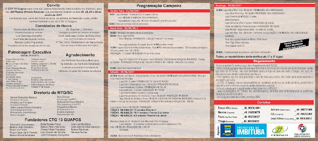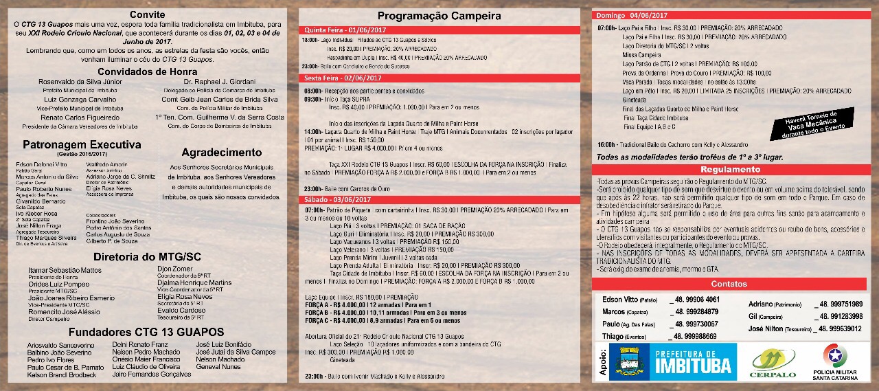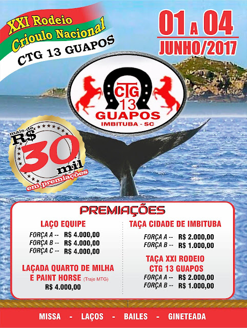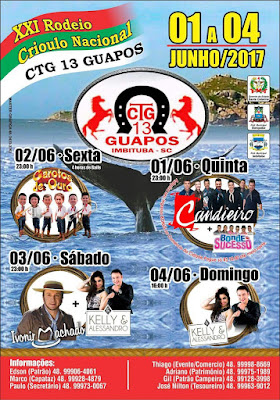 Caros amigos, estendo aqui o convite a todos, para prestigiar e participar do 21º Rodeio Crioulo Nacional do CTG 13 Guapos, que acontece na cidade de Imbituba – SC, entre os dias 01 a 04 de Junho deste corrente ano. Na parte campeira a premiação oferecida aos competidores ultrapassa os R$ 30 Mil. Na artística bailes com Garotos de Ouro, Ivonir Machado, Grupo Candieiro, Kelly & Alessandro, entre outros.
