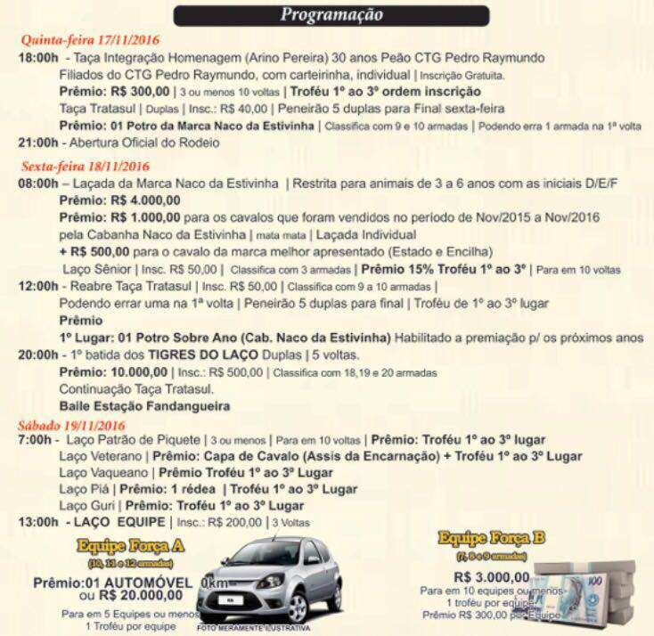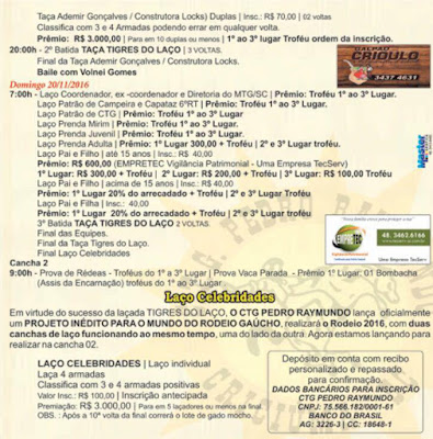 Falei hoje de manhã com o patrão Toni, e o mesmo foi categórico em afirmar que a programação do evento não muda em nada. Que a laçada Taça Tigres do Laço seguirá no mesmo formato. Toni disse ainda ser grato a Davi, pelos serviços prestados e lamenta sua saída da diretoria.