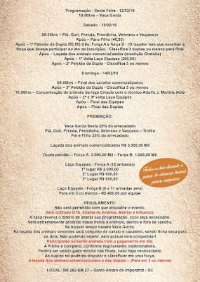 Pois a diretoria da Fazenda Schurhaus, elaborou essa programação pensada especialmente para vocês amigos, que gostam de um bom tiro de laço.