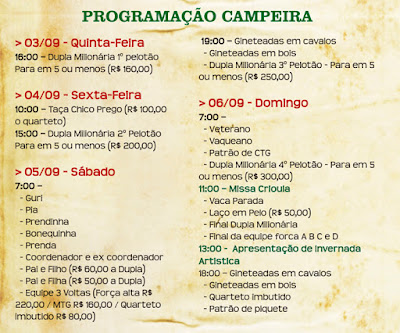 Acho que a maioria sabe da infraestrutura do parque, que conta com boa área de acampamento, sendo extensa e verde. A cancha de provas é excelente e conta com arquibancada coberta. O gado que será disponibilizado, promete ser de boa qualidade. Também há dois grandes salões e uma variada programação de shows e bailes. Portanto venha viver momentos inesquecíveis conosco. É certo que será uma grande festa, e o desfecho dela depende de você que é nosso convidado especial.